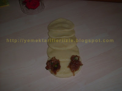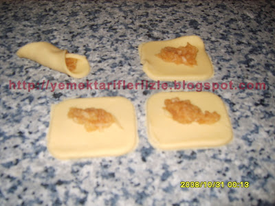 Ilk olarak elmali harcimizi yaparak basliyoruz. Elmalarimizi soyduktan sonra rendeliyor ve ardindan uzerine toz seker ve tarcin ilave ederek bir tencere veya tavada elmamizi kavuruyoruz. Kavurdugumuz elma puremizi daha sonra sogumaya birakiyoruz.